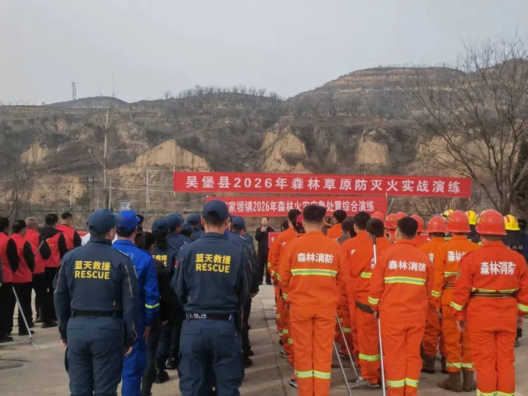 3月26日,吴堡县在寇家塬镇开展2026年森林草原防灭火实战演练。县应急管理局、林业局、消防救援大队、蓝天救援队及寇家塬镇等单位100余名工作人员参加演练。