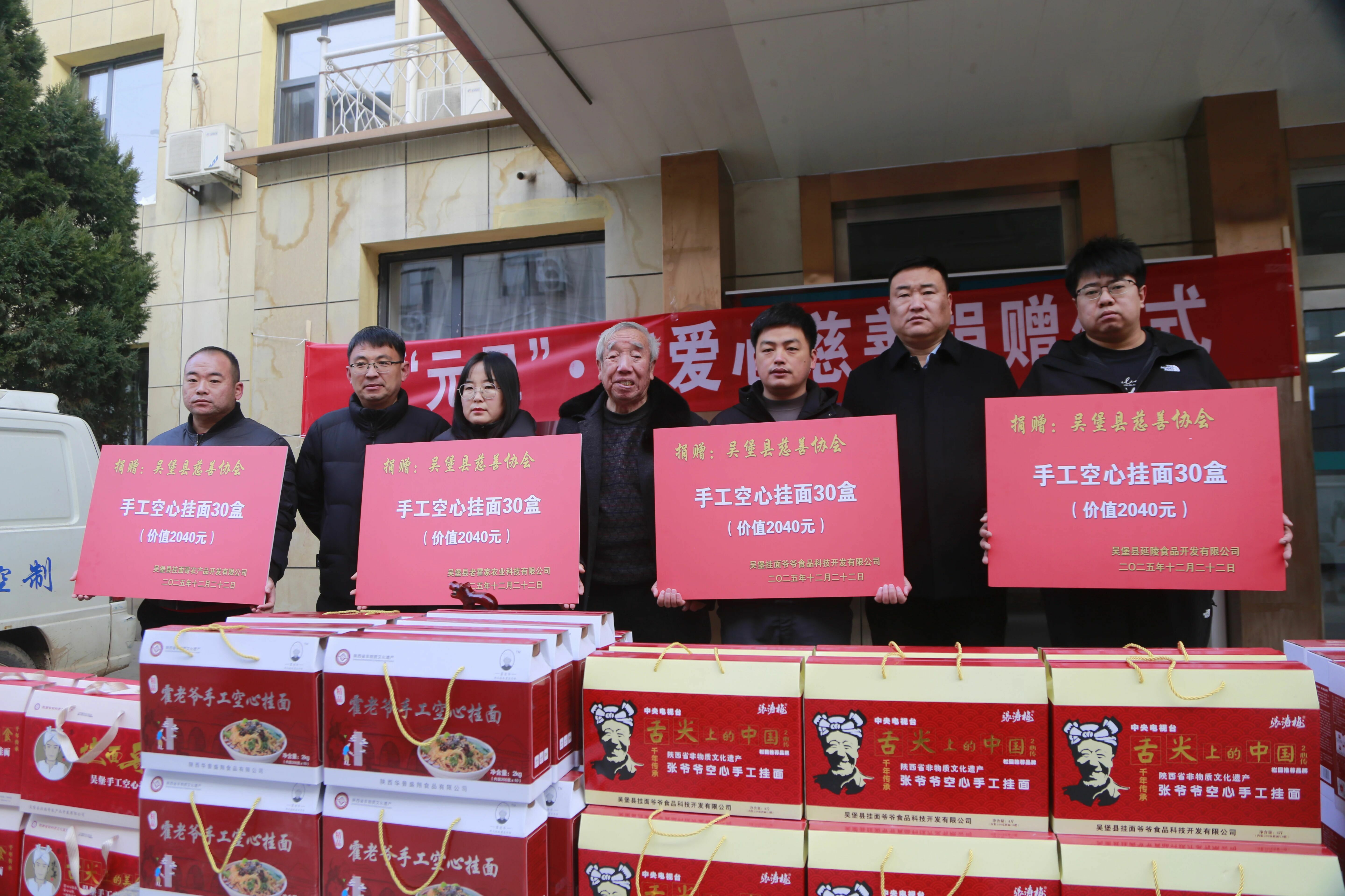 本次活动由吴堡县工业商贸局倡导发起,吴堡县老霍家农业科技有限公司、吴堡县挂面哥农产品开发有限公司、吴堡挂面爷爷食品科技开发有限公司、吴堡县延陵食品开发有限公司四家本土挂面企业积极响应,各捐赠手工空心挂面30盒,总计120盒,价值8160元。