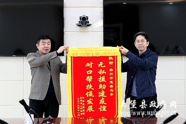 吴堡县委副书记殷海舰出席捐赠仪式,并代表吴堡县向扬州市慈善总会赠送印有“无私捐助建友谊,对口帮扶促发展”字样的锦旗。捐赠仪式由吴堡县委常委、政府常务副县长曹龙主持。
